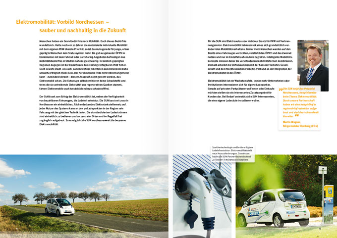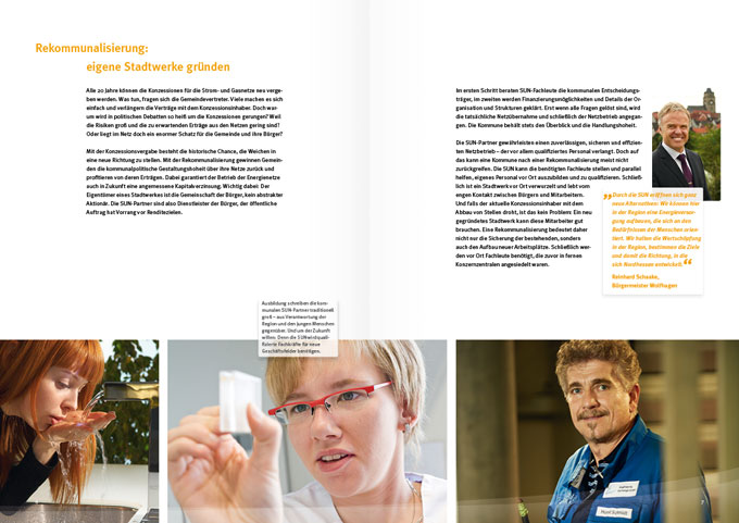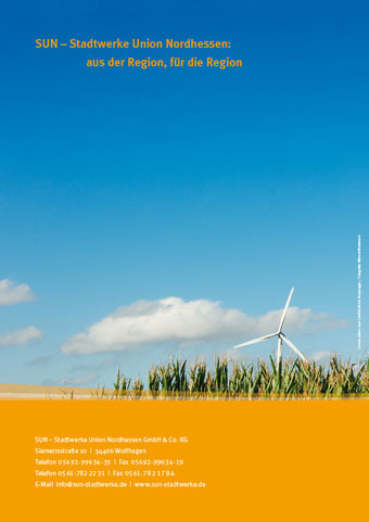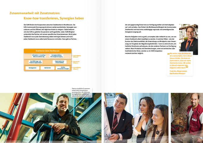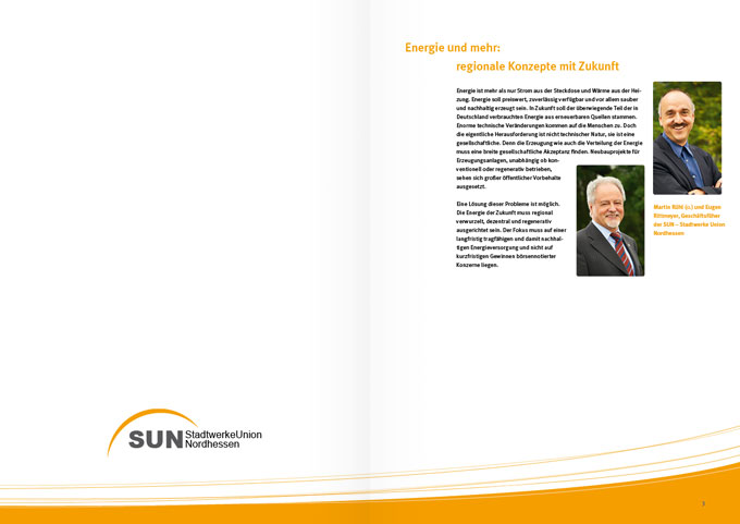 Imagebroschüre SUN StadtwerkeUnion Nordhessen SUN Stadtwerkeunion Nordhessen Die 16 seitige Broschüre kommuniziert das Konzept der SUN zum Energiewandel mit regionalen Ressourcen. Konzept, Layout, Satz, Erstellung der Grafiken, Bildkonzept Partner: Wiedemann Fotografie |